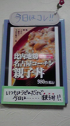 a5518971.jpg若い女の子二人がお昼時にご来店。女の子ひとりの方は、すぐに『旬のかき揚げうどん』と決まりましたが、もう一人のかたはメニューの多さになかなか決まらないようで…やっと『やさいうどん』を注文したものの、なかなか落ち着かない様子で、『やっぱり比内地鶏・名古屋コーチン親子丼』(税込980円)に変更されました。丼ぶりのふたを開けたとき『うぉぉぉ〜うまそ〜』と絶叫の嵐でした。いつも親子丼を頼まれた方の表情が楽しみです。