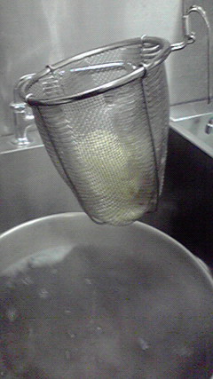 アチチの熱湯いっぱいのゆで釜でゆでられるのを今か今かと待っている。ただじっと待っている…。