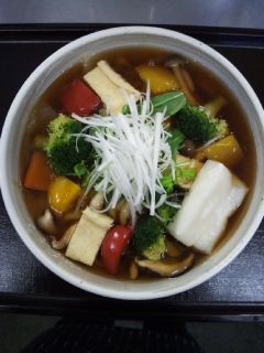 器も立派になって、色とりどりの鮮やかな大きめ野菜がたっぷり入った美しさ。ブロッコリーやパプリカなど8種類の野菜がカラダに嬉しい、お餅も入って、ちょっとワンランク上な上品な一品となっております(^ー^)